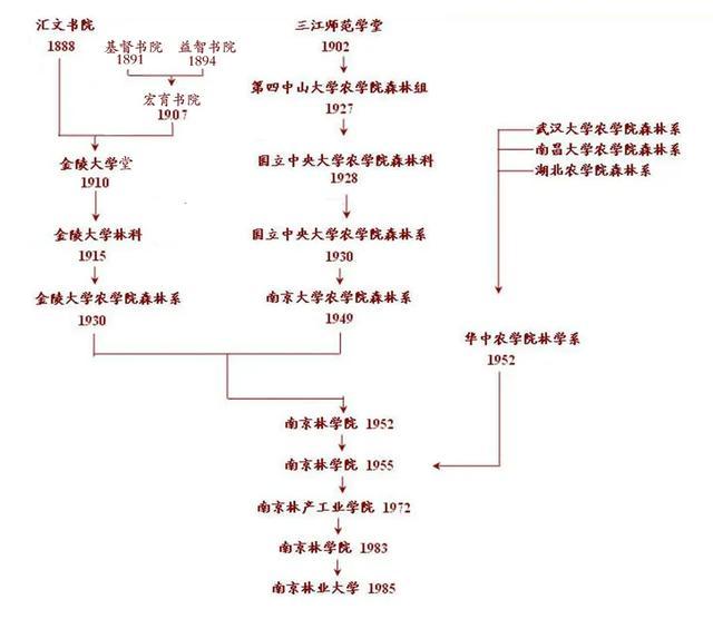 南京林业大学前身可溯源至1902年三江师范学堂农学博物科和1914年金陵大学农科。1952年,以南京大学林学院(原国立中央大学林学院)、金陵大学林学院为主体,合并成立南京林学院,是当时全国仅有的三所高等林业院校之一。1955年华中农学院林学系(武汉大学、南昌大学和湖北农学院森林系合并组成)并入,1972年更名为南京林产工业学院。1983年恢复南京林学院名称,1985年更名为南京林业大学。