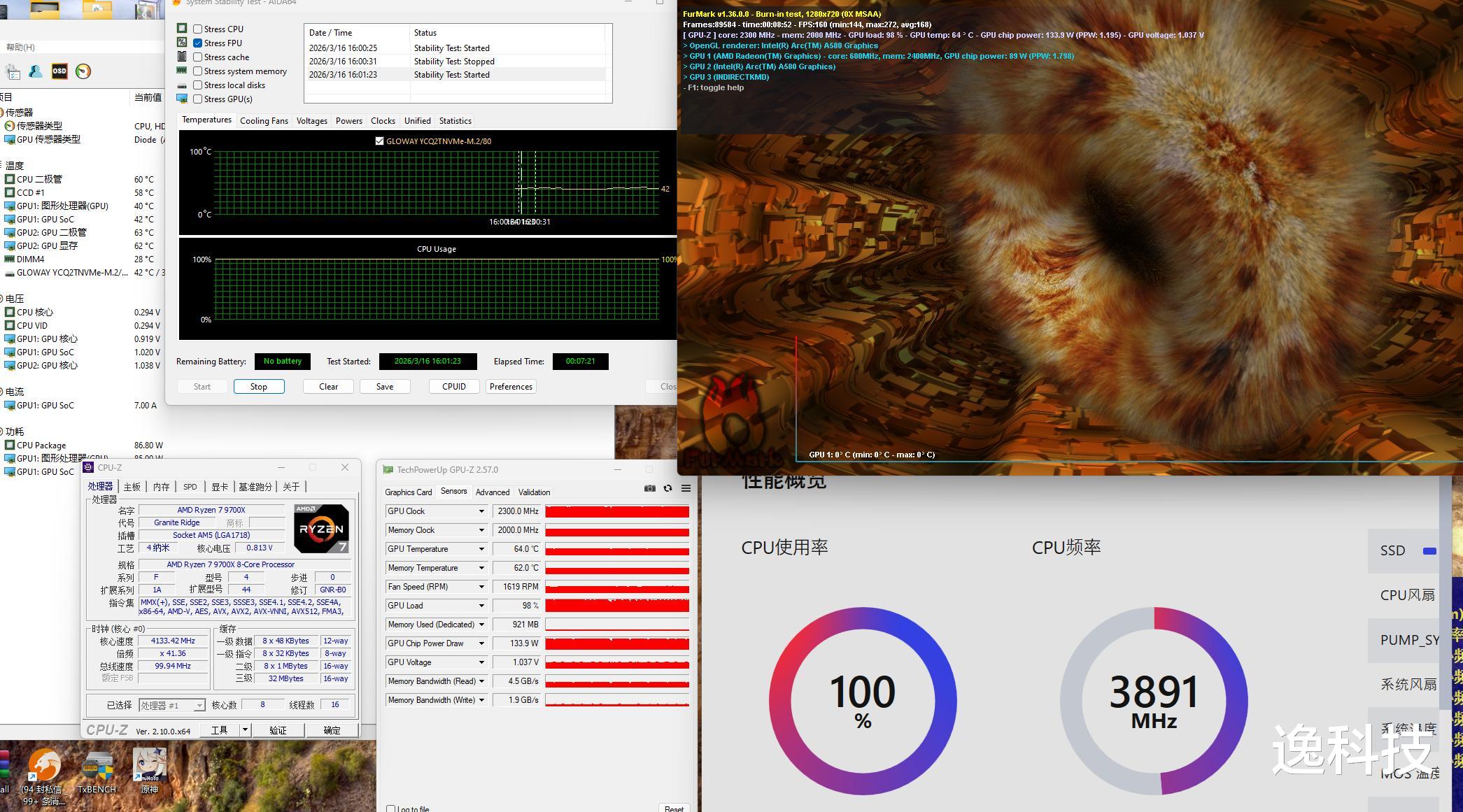 来看看不超频的实际测试, CPU-Z 与 FURMARK 工具进行双烤压力测试,结果如下:在 CPU 高负载烤机时,温度仅 60℃,功耗稳定保持在86W;显卡温度仅 64℃,功耗稳定保持在133W,对于这个配置满载来说,温度控制的非常出色,当然这样离不开机箱合理的风道设计,风扇满配对降低温度非常有帮助。