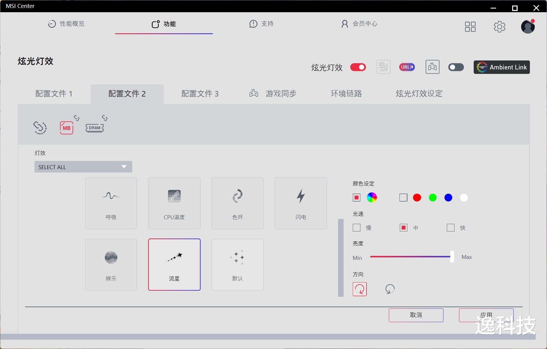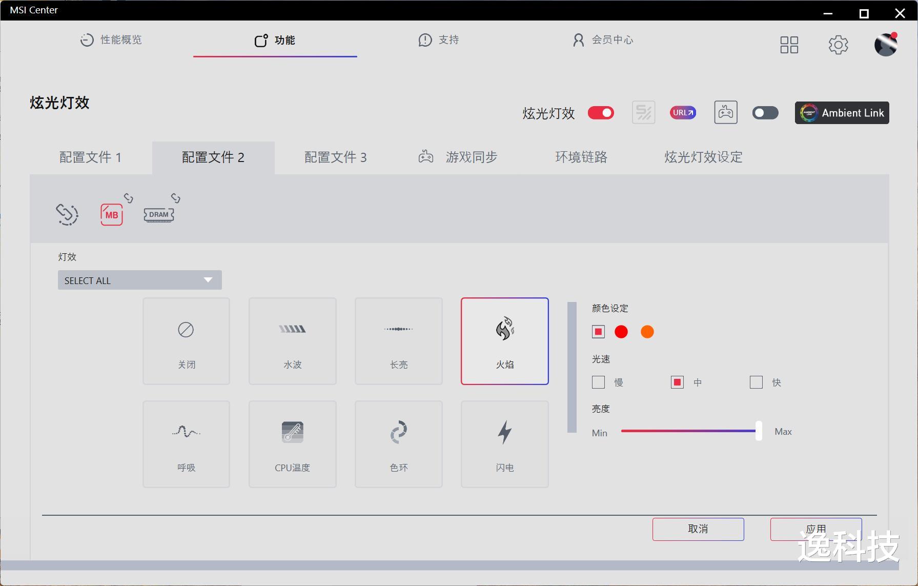 通过MSI CENTER可以控制整体硬件的灯光效果,这里就简单的展示两种;第一种火焰!