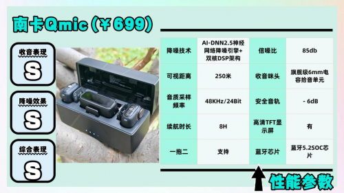 为了提供更贴合创作者和专业场景的收音体验,南卡QMic也是下足了功夫,性能配置全面优于同级标准,搭载48kHz采样率+24Bit位深的专业录音规格,人声还原度实测接近满分的98%以上,并配置AI-DNN2.5神经网络降噪,使得声音更稳定,人声纯净直逼录音棚级。还支持重度/轻度双档可调降噪、20档增益调节、6dB安全音轨实时备份、实时监听耳返等多种功能,其内置的鲸语Comm通信技术,实现最远250米稳定收音,配置性能直接拉满,难怪有知名数码媒体给出了非常高的评价:被誉为旗舰级领夹麦克风的巅峰之作。