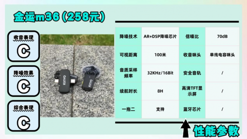 金运M36发射器仅9.9g,长条磨砂机身搭配金属背夹,夹衬衫领口几乎无感,久戴也不会拉扯衣物下坠,对长时间外拍很友好。操作逻辑简单,三档音量旋钮调节直观,新人上手无需复杂调试,且Type-C与Lightning双接口设计,换设备不用额外适配转接头。但设计短板明显:背夹夹持力偏松,剧烈跑动时易移位,需频繁手动调整;充电盒体积偏大,比普通耳机盒宽一圈,装紧身裤口袋有明显坠感;机身无屏幕,电量全靠LED灯显判断,强光下根本看不清状态。