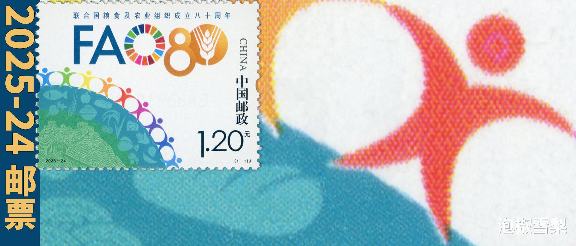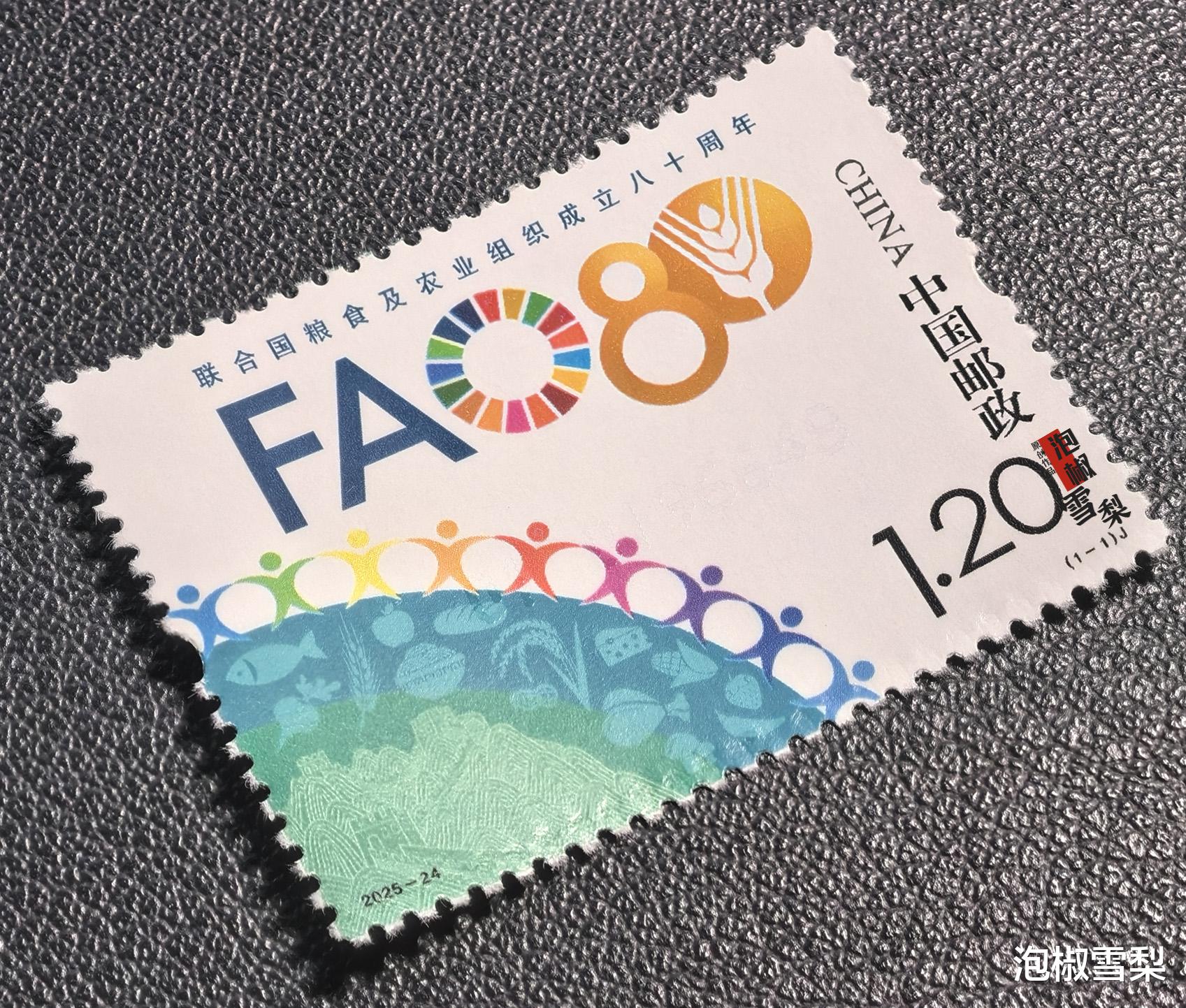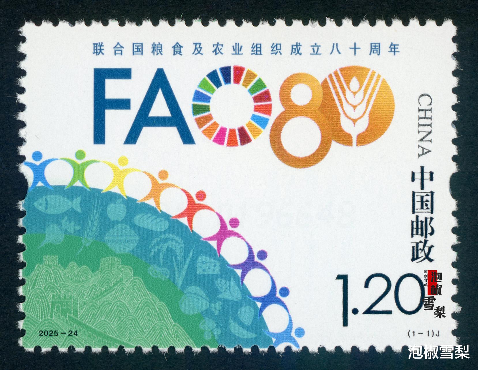 2025年10月16日,中国邮政发行《联合国粮食及农业组织成立八十周年》邮票1套1枚,北京邮票厂影写版印刷,设计者沈嘉宏,计划发行量460万套,总面值552万元。