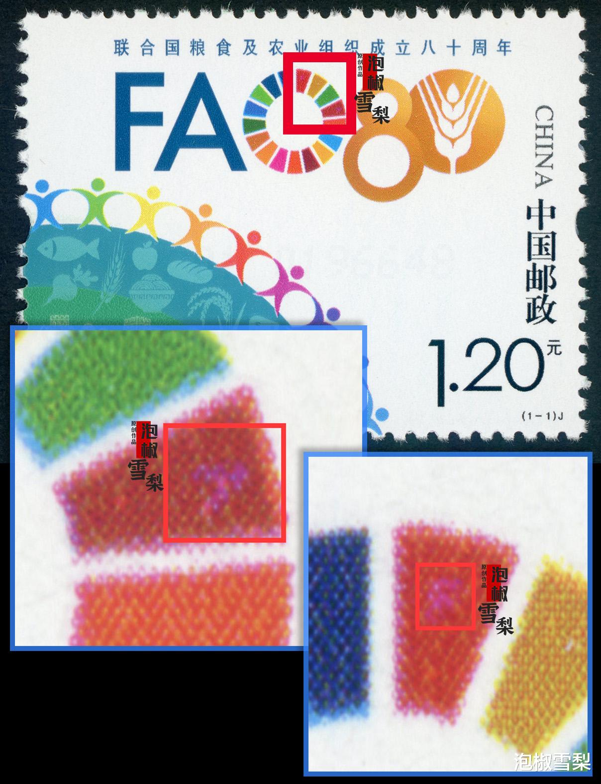 邮票暗记采用缩微大写字母“F”“A”,均在标识“O”的彩色色块内,但颜色与色块相近,即使放大也不易看清。