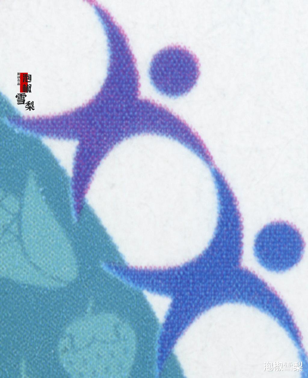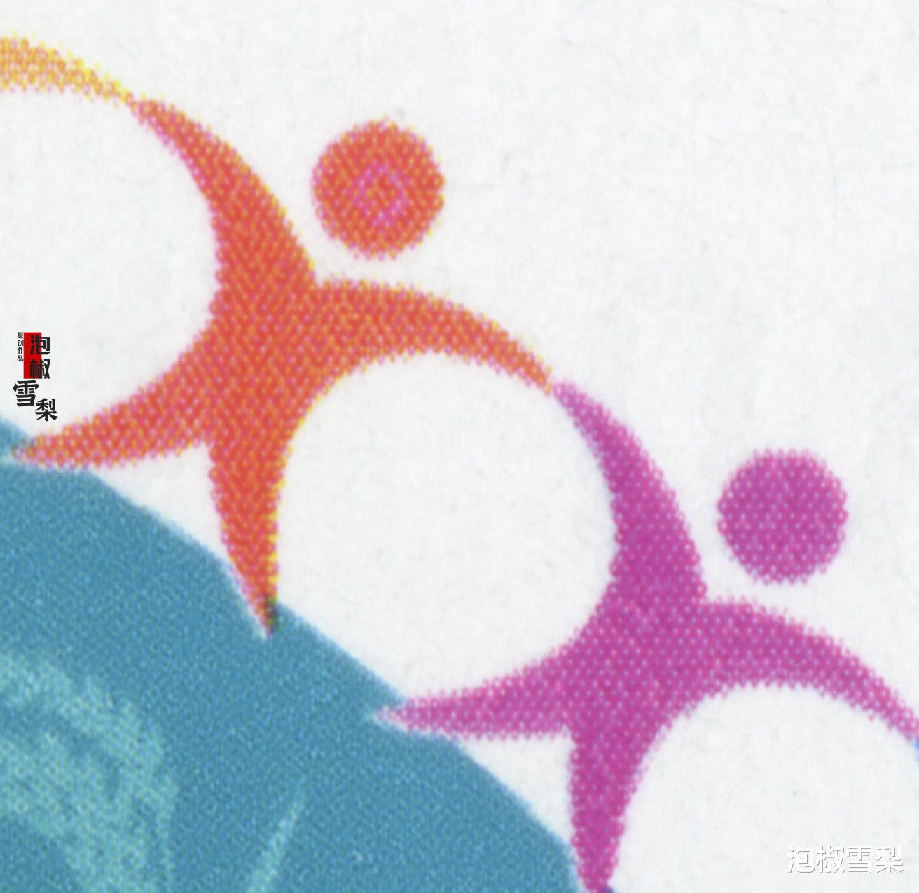 邮票没有太多惊艳的荧光效果,部分剪纸小人及色盘上红色部分为荧光油墨印刷,荧光编码位于邮票中部,和荧光小人有重叠。
