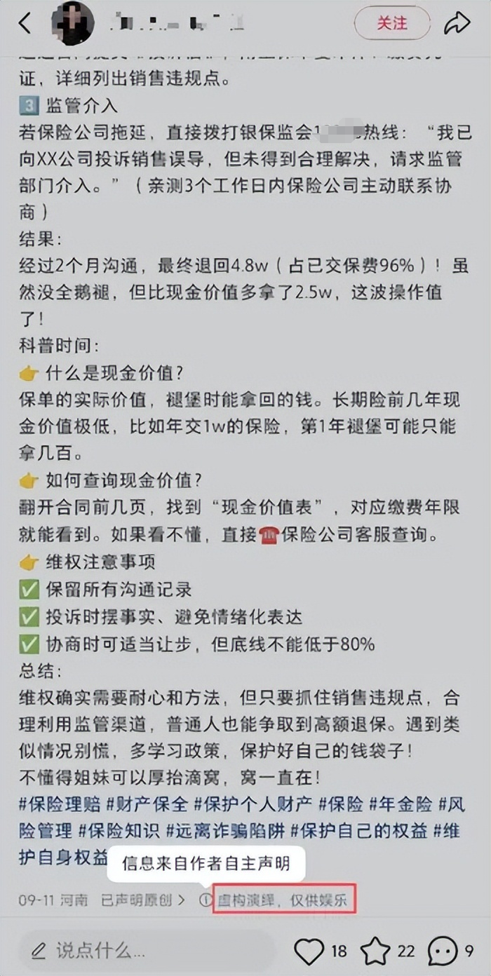 不法分子在小红书等平台伪装成法务或专业人士,发布“全额退保攻略”、“维权经验”等内容。这些笔记往往以“真实案例”包装,详细描述退保步骤,结尾却标注“虚构演绎,仅供娱乐”,同时在评论区引导用户私聊,最终将其引流至微信等私域渠道,签署代理协议并收取高额手续费。黑产甚至形成了标准化教案,总结出“X年保单+困境描述+高比例结果”的爆款公式,高效围猎遇到保险纠纷的消费者。