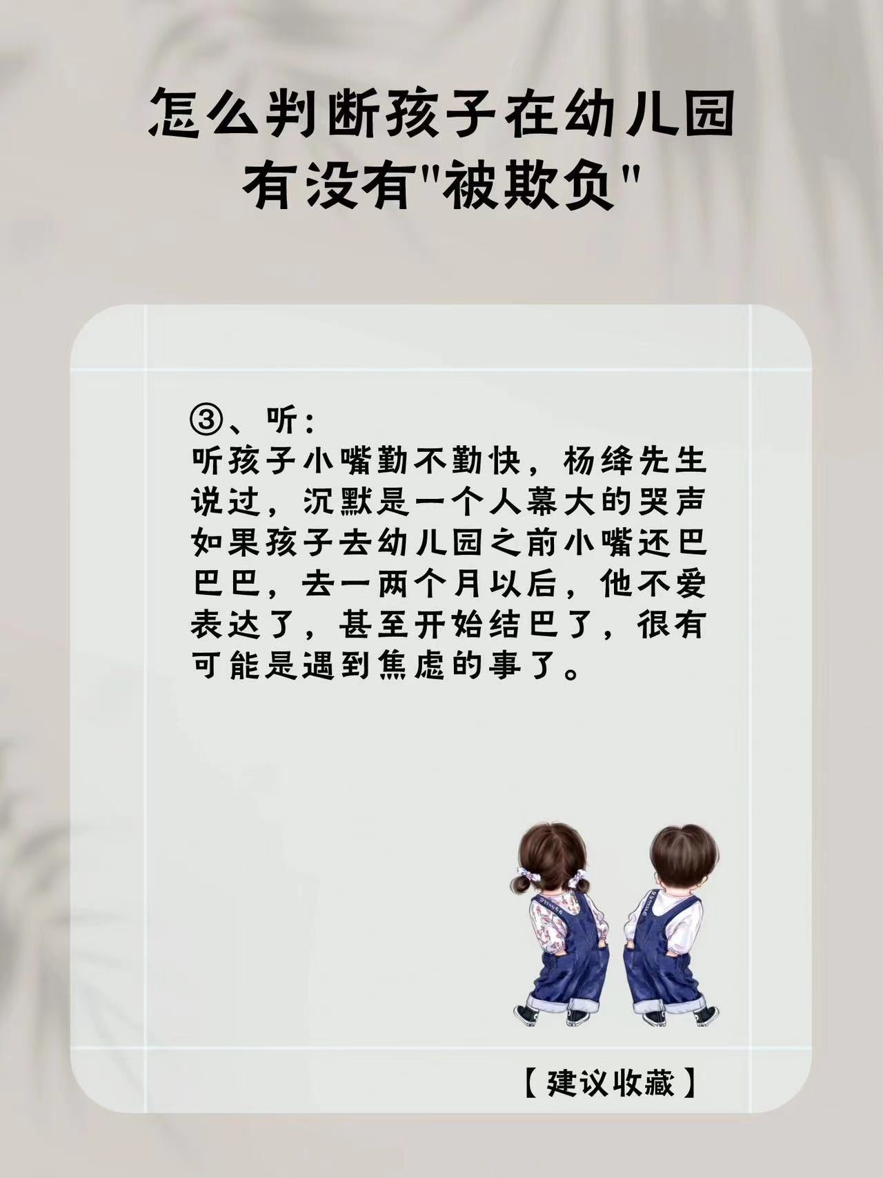 宝宝刚离开家进入幼儿园这个小小社会,妈妈们那是一百个不放心,那怎么判断孩子在幼儿园有没有“被欺负”呢?