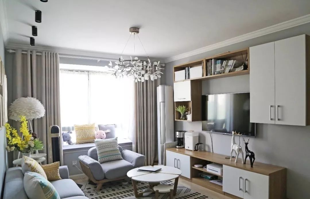 取消传统的电视背景墙,以一组实用的柜子代替,更适合小户型的收纳空间需求。