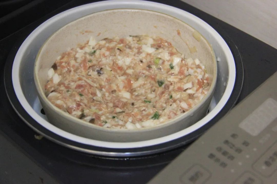 调制馅料,我习惯将香菇和大葱提前炒一下,去了生味,再和肉馅一起拌。