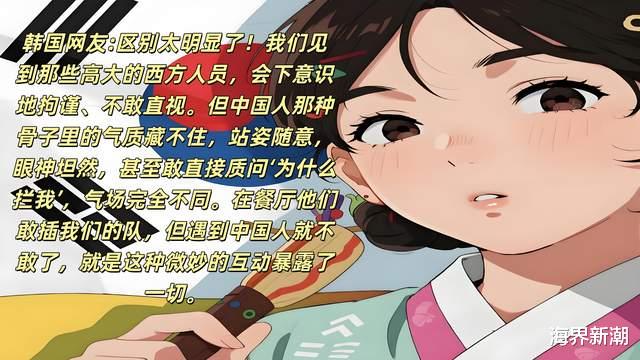 韩国网友的评论一针见血:“区别太明显了!我们见到那些高大的西方人员,会下意识地拘谨、不敢直视。但中国人那种骨子里的气质藏不住,站姿随意,眼神坦然,甚至敢直接质问‘为什么拦我’,气场完全不同。在餐厅他们敢插我们的队,但遇到中国人就不敢了,就是这种微妙的互动暴露了一切。”