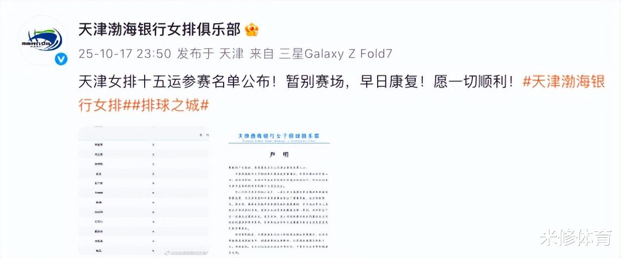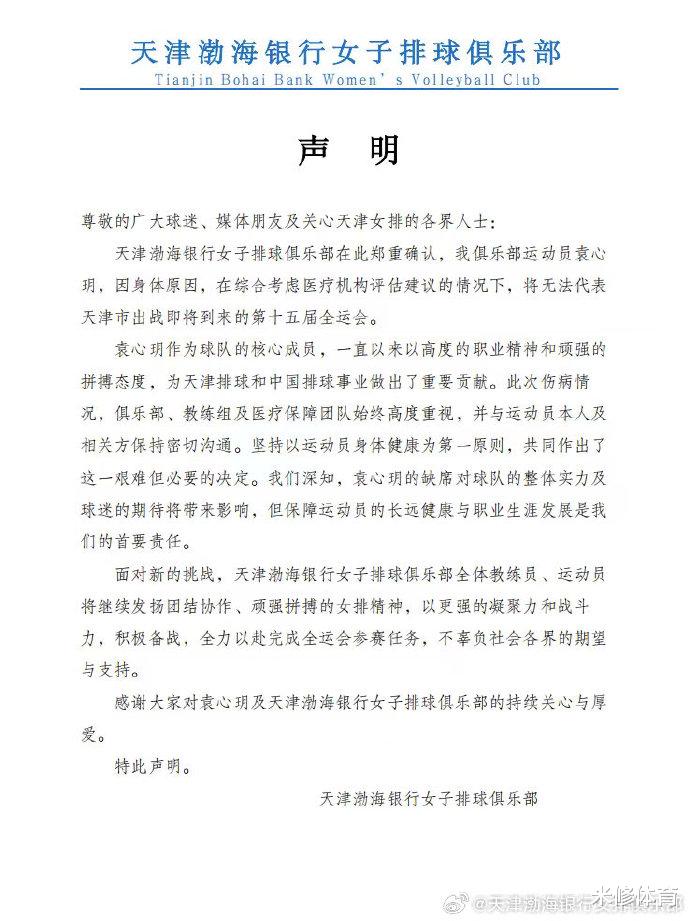 10月17日23时50分,天津女排官方发布声明,表示袁心玥因身体原因,在综合考虑医疗机构评估建议的情况下,将无法代表天津市出战即将到来的第十五届全运会。