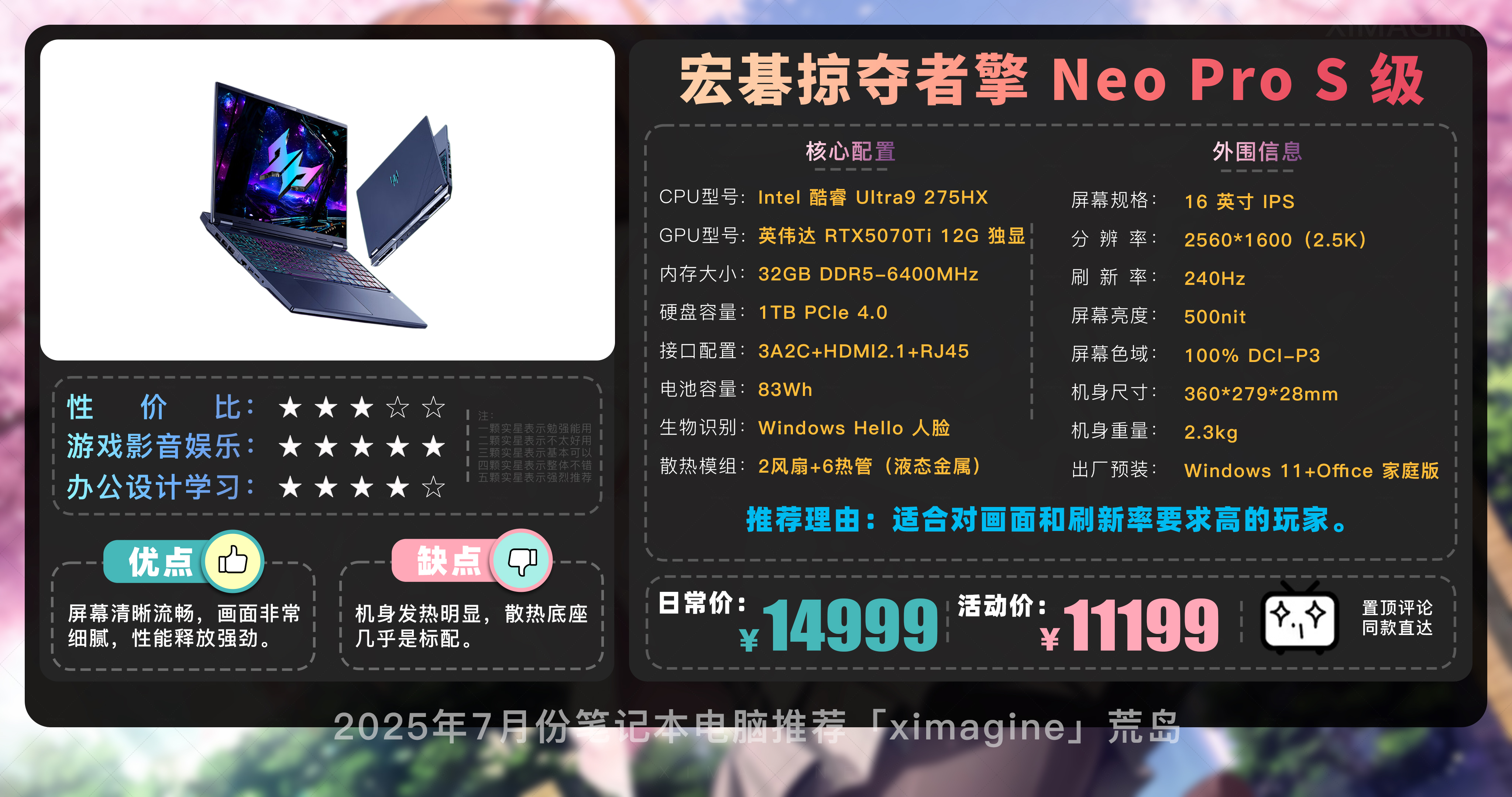 宏碁掠夺者擎 Neo Pro S 级,采用酷睿 Ultra9 275HX 处理器 RTX5070Ti 12G 独显,32G D5内存 1T固态硬盘16寸 2.5K IPS屏,给我的体验是性能释放非常强劲,长时间高负载游戏时散热表现稳定,机身温度控制得很好。玩大型3A游戏如赛博朋克2077和永劫无间时,帧数保持流畅且稳定,游戏画面细腻,沉浸感强。键盘反馈扎实,适合长时间游戏和打字。风扇声音较大,机身设计硬朗,造型偏向电竞风,重量较重不适合携带。续航表现一般,更适合桌面替代使用。当前活动价 11199 元,性能和做工都匹配,适合追求极致性能的重度玩家。