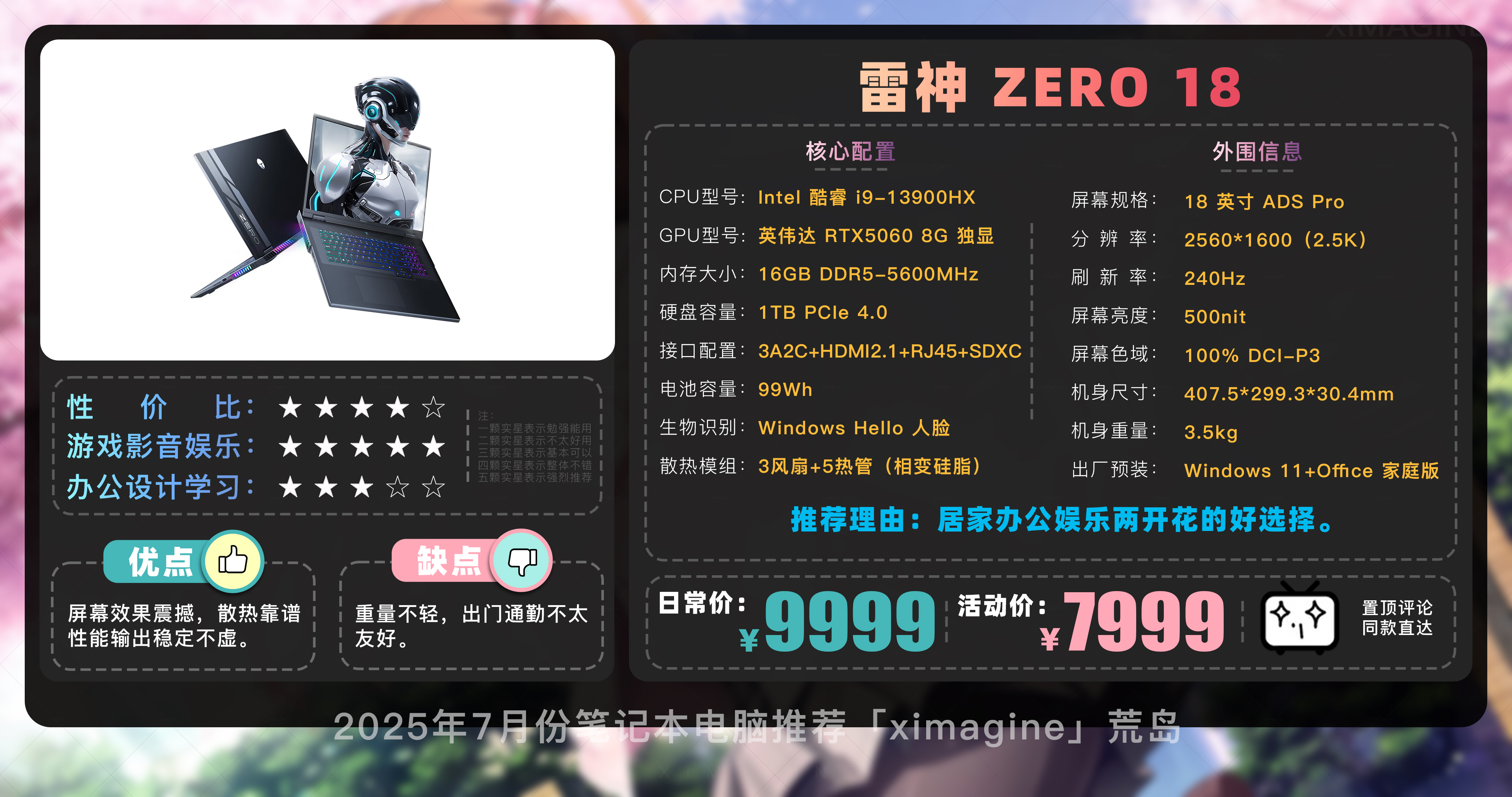 雷神 ZERO 18,采用酷睿 i9 13900HX 处理器 RTX5060 8G 独显,16G D5内存 1T固态硬盘16寸 2.5K ADS Pro屏,强劲性能给需要高效办公和游戏体验的用户提供支持,散热系统表现出色,即使长时间高负载运行,温度依然保持稳定。屏幕显示细腻,色彩还原真实,适合设计和视频剪辑。键盘手感良好输入体验舒适,虽然机身稍显厚重,但考虑到性能释放,还是情有可原的。续航表现中等,更适合桌面替代使用。整体体验下来,它兼顾了高性能和一定的便携性,是一款适合多任务处理的全能本。当前活动价 7999 元,性价比突出。
