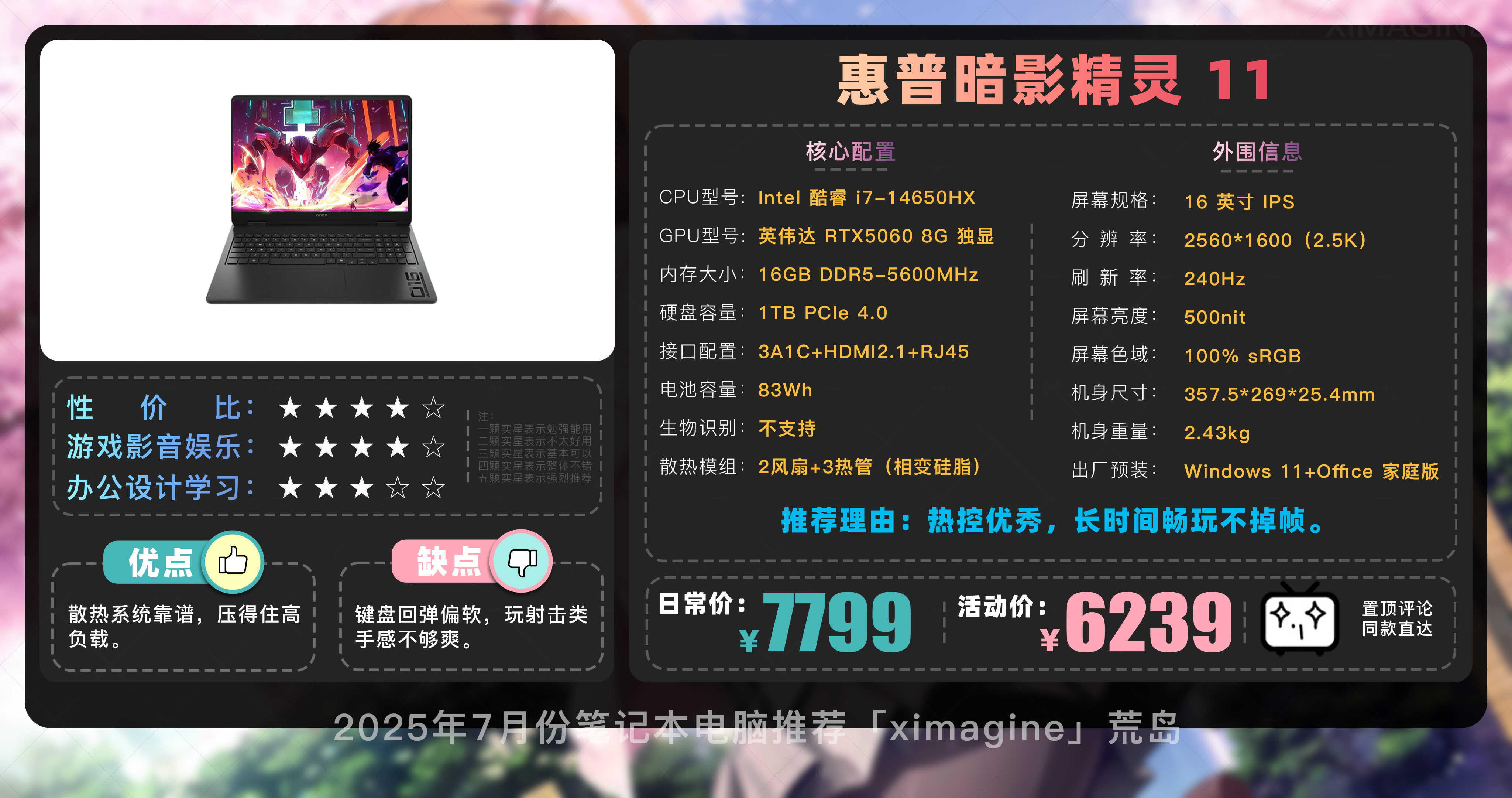 惠普暗影精灵 11,采用酷睿 i7 14650HX 处理器 RTX5060 8G 独显,16G D5内存 1T固态硬盘16寸 2.5K IPS屏,给我留下了稳重靠谱的印象,散热表现超出预期,连续玩赛博朋克2077两个小时后,掌托依然凉爽,风扇声音不会过于吵闹,游戏体验非常顺畅。键盘手感偏柔和,敲击反馈舒适,适合喜欢轻柔打字的人。除了游戏,它在视频剪辑和建模渲染方面也能稳定运行,机身设计低调不张扬,是兼顾游戏和办公的均衡之选,而且它的续航和便携性也表现不错,满足需要偶尔外出的用户可以。当前活动价 6239 元,是一台拥有均衡性能的游戏本。