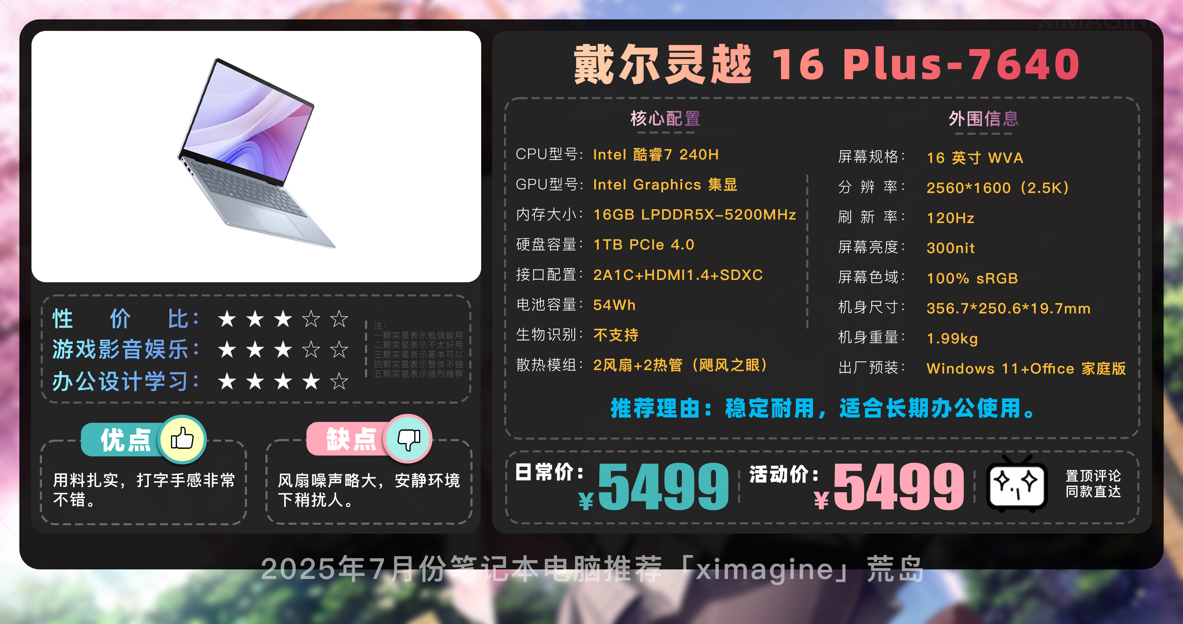 戴尔灵越 16 Plus-7640,采用酷睿 7 240H 处理器 Graphics 集显,16G LPD5X内存 1T固态硬盘16寸 2.5K WVA屏,在办公和娱乐之间表现均衡,屏幕大且清晰,色彩还原真实,适合追剧和图片编辑,处理器性能满足日常办公多任务运行流畅,键盘手感适中,长时间输入无压力。续航表现中规中矩,日常使用不焦虑,机身略厚重,不是特别轻便,但整体做工扎实,适合需要稳定性能的用户。风扇噪音在高负载时会稍微明显,好在还能接受。当前活动价 5499 元,是一台稳重可靠的全能轻薄本,对性能和实用性有一定要求的用户可以冲。
