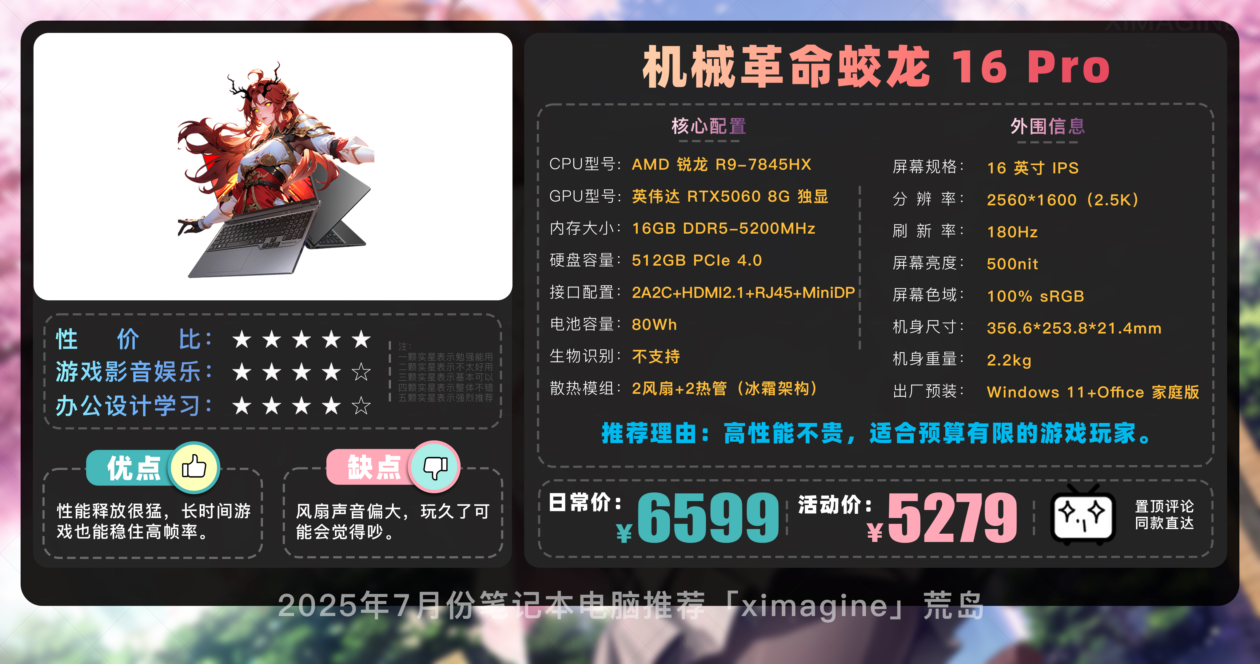 机械革命蛟龙 16 Pro,采用锐龙 R9 7845H 处理器 RTX5060 8G 独显,16G D5内存 512G固态硬盘16寸 2.5K IPS屏,给我的第一感觉就是猛,用它玩巫师3和永劫无间,帧数稳定又流畅,游戏体验非常爽快。操控灵敏,接口丰富,能接各种外设。不仅支持办公和剪辑,但显然更适合游戏,毕竟体积和重量让它没那么便携。散热能力很强,但风扇声音偏大,在安静环境使用时容易被打扰。如果你预算有限又想玩大型3A游戏,它在性能释放和稳定性之间拿捏得很到位,对于多任务处理也有不错表现,能满足日常创作需求,当前活动价 5279 元,整体来说是一台性能强劲、适合硬核玩家的游戏本。