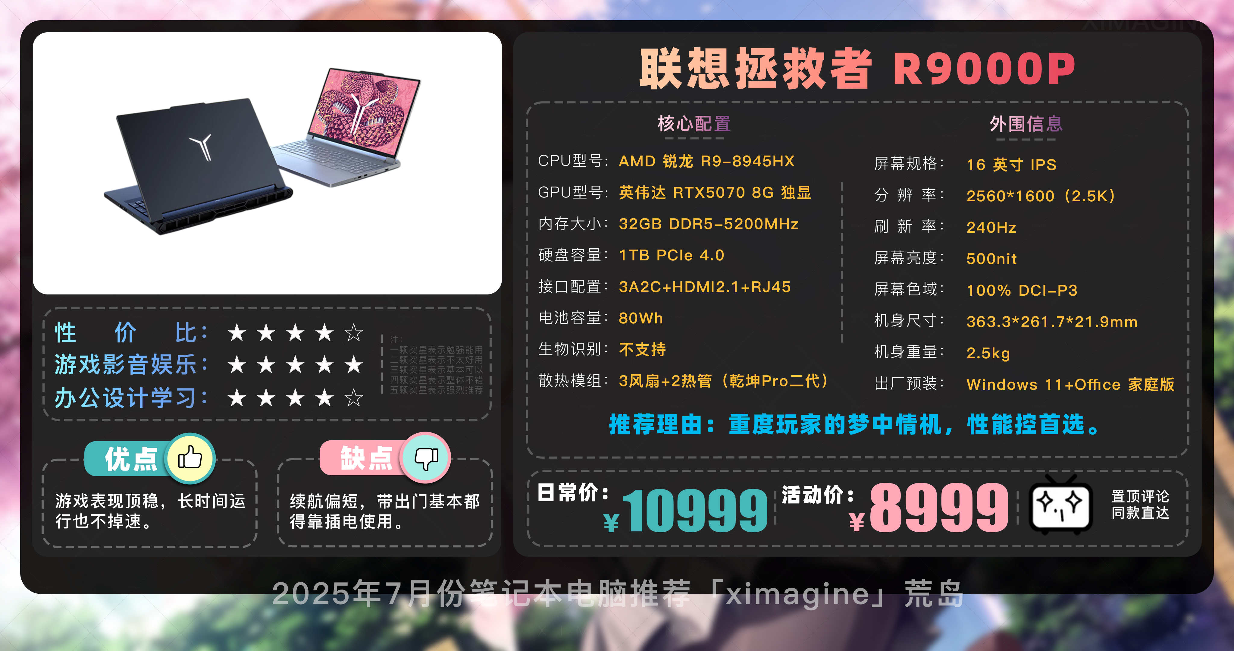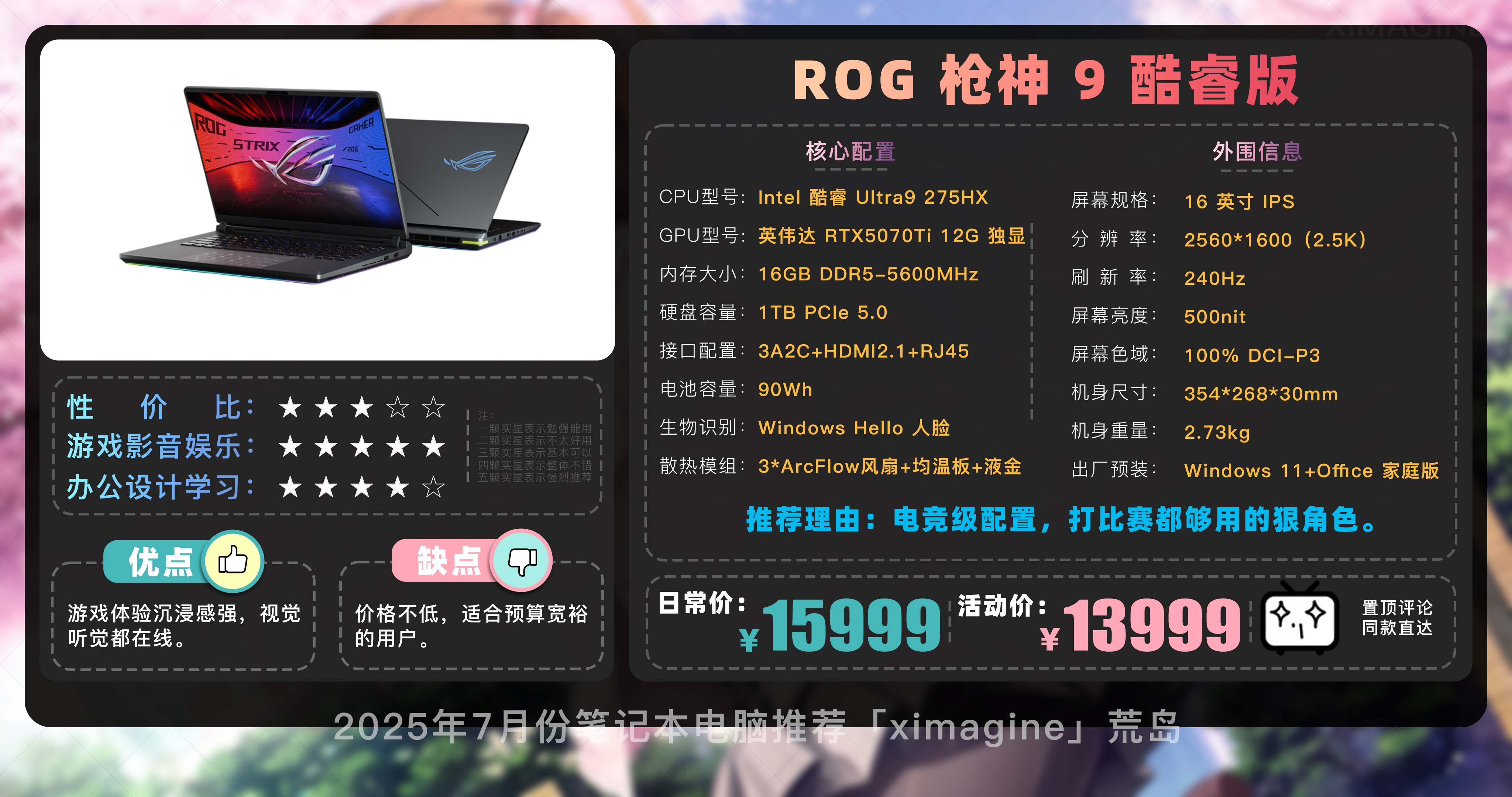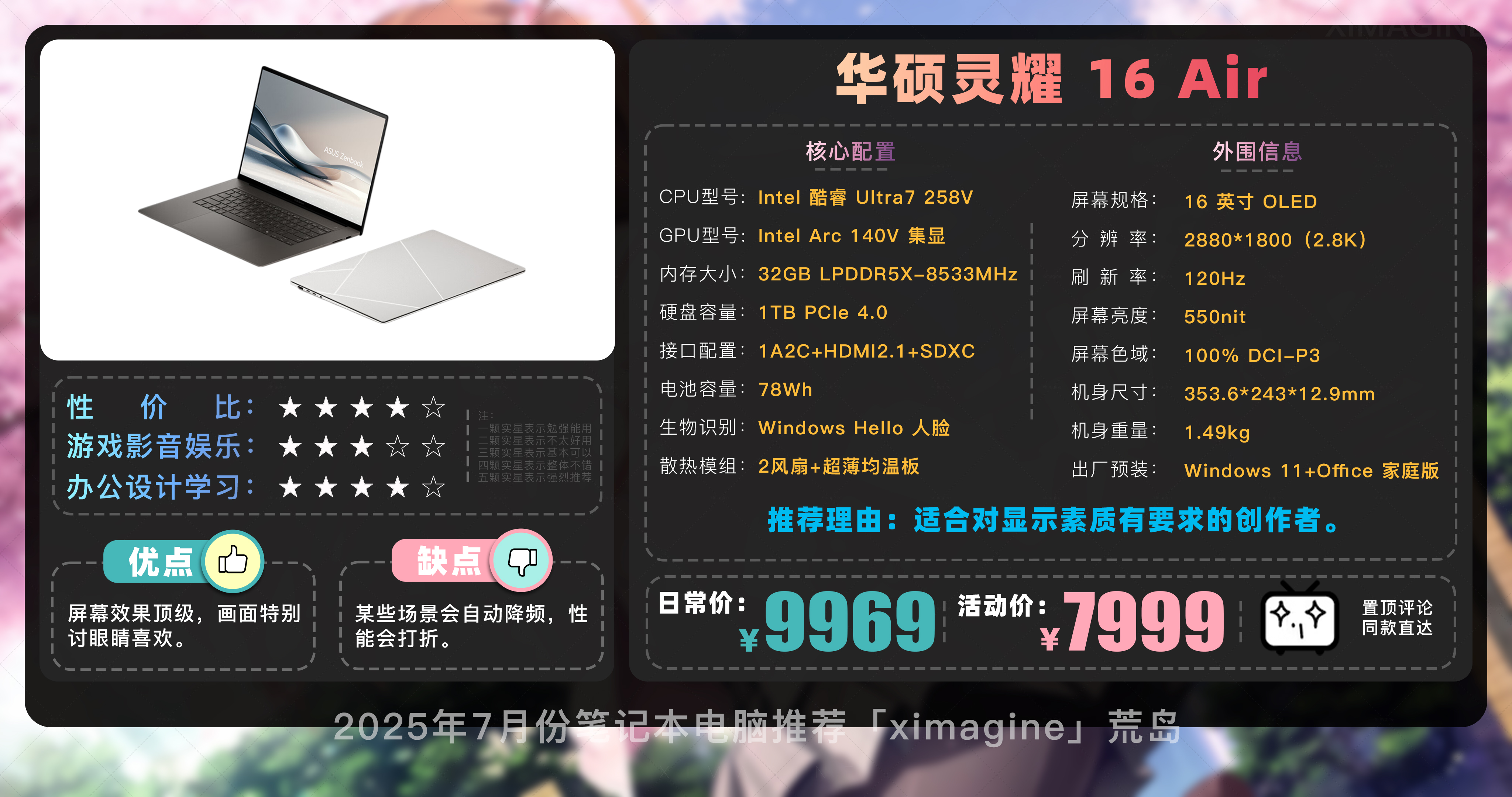 以上就是2025年7月笔记本电脑推荐,如果有心水的型号,可在置顶评论区直达!选笔记本电脑没有绝对的好坏,关键得看你的预算?你放在哪用?你想怎么用?游戏党就别为了一点轻薄牺牲帧率,通勤党也别为了光污染多背一公斤,而全能党就要学会平衡性能和便携了。本期就到这,如果觉得内容对你有所帮助,请三连支持!我是「ximagine」下期再会!