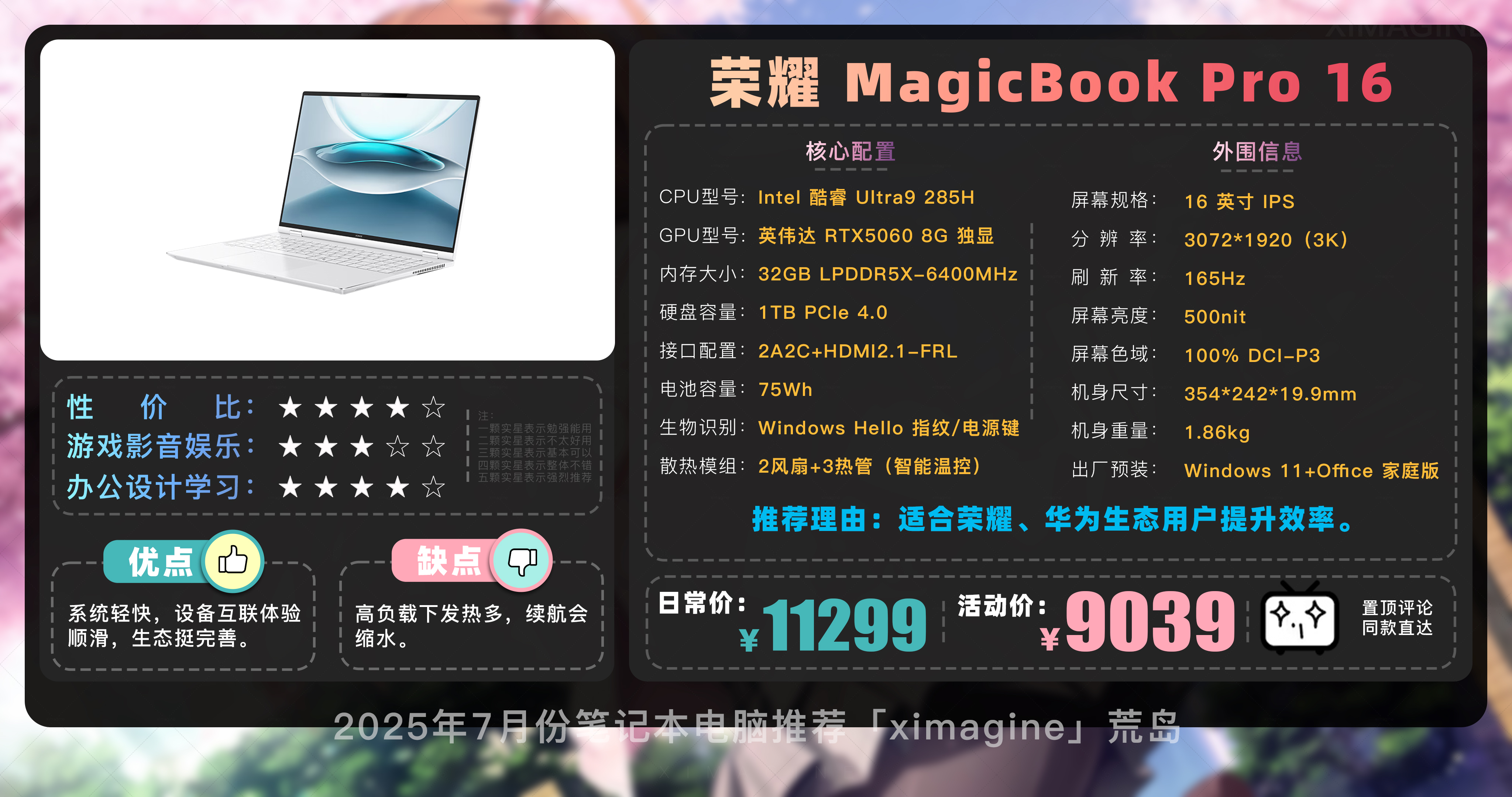 荣耀 MagicBook Pro 16,采用酷睿 Ultra9 285H 处理器 RTX5060 8G独显,32G LPD5X内存 1T固态硬盘16寸 3K IPS屏,设计简洁时尚以轻薄便携著称,适合日常办公和轻度创作。屏幕色彩鲜艳,观感舒适,性能稳定,办公软件和视频剪辑都能流畅运行。键盘手感适中,打字体验良好,续航表现出色,满足全天候办公需求,风扇声音较低,给予你无干扰的安静环境。当前活动价 9039 元,是一款适合学生和职场新人使用的全能本,兼顾性能与便携,整体体验平衡,是值得考虑的选择。