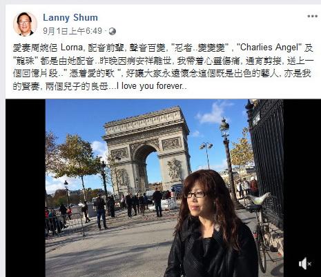 【前TVB配音员周婉侣加拿大病逝】继「配音王」上周六(9月5日)病逝后,1980年代曾声演《忍者小灵精》主角「小灵精」、《龙珠》主角孙悟空前TVB配音员,原来亦于8月31日晚在加拿大离世,终年69岁。 周婉侣的丈夫岑南羚(Lanny)透露太太离世的消息︰「爱妻周婉侣Lorna,配音前辈,声音百变,《忍者..变变变》、《Charlies Angel》 及 《龙珠》 都是由她配音..昨晚因病安祥(详)离世, 我带着心灵伤痛,通宵剪接,送上一个回忆片段..《凭着爱的歌 》,好让大家永远怀念这个既是出色的艺人,亦是我的贤妻,两个儿子的良母...I love you forever..」