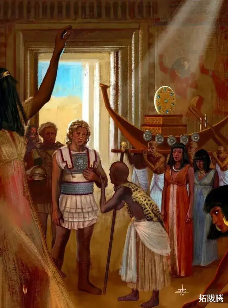 公元前332年11月,亚历山大兵不血刃进入埃及,被埃及祭司宣布为“阿蒙神之子”(国王),实际上成为埃及的法老。