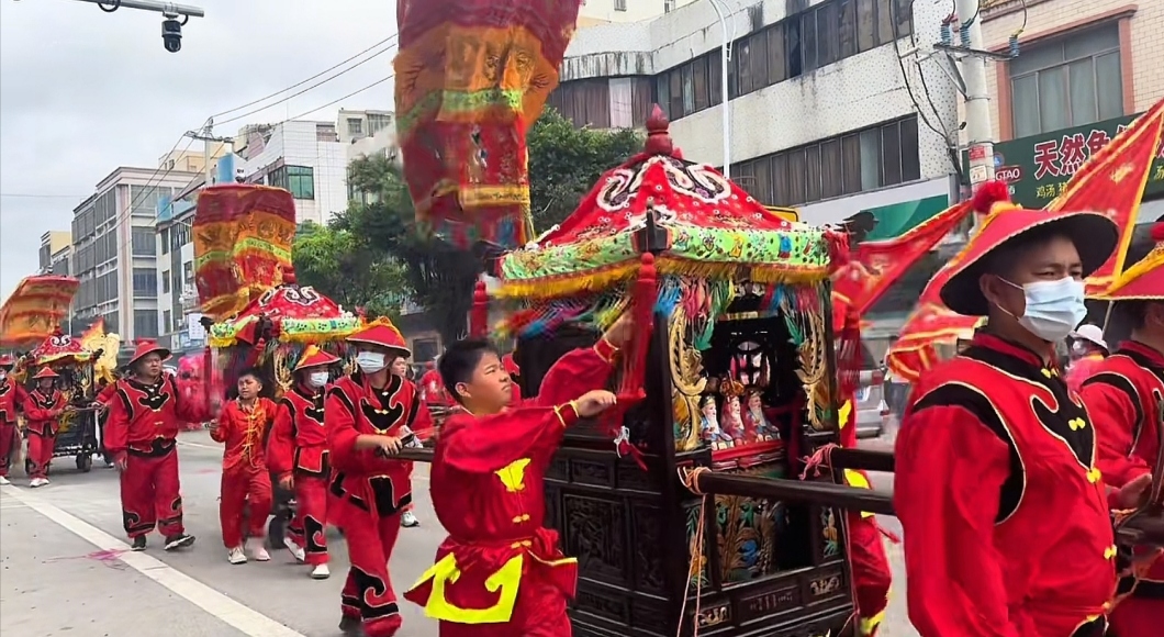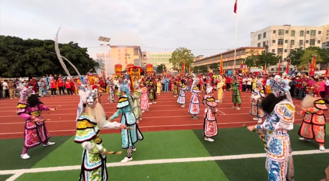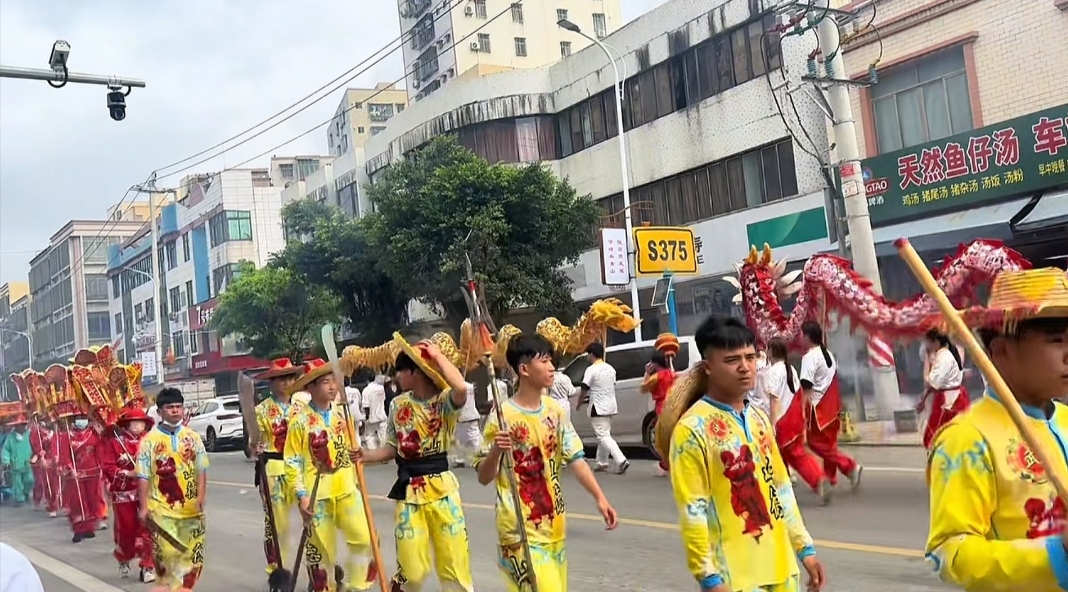 今年的游神队伍,堪称一场民间艺术的盛宴。来自潮汕地区汕头市的龙兴英歌舞团队甫一亮相,便以其刚劲雄浑、气势磅礴的舞姿引爆全场。他们脸涂油彩,手持短棍,随着鼓点跳跃击打,再现了古战场勇士出征的豪情。紧随其后的是湛江赤坎调顺村的双网龙队,龙身翻腾,灵动非凡;而遂溪城月镇和客路新村的腰鼓队,则以欢快的节奏和整齐的舞步,为巡游增添了浓浓的喜庆色彩。