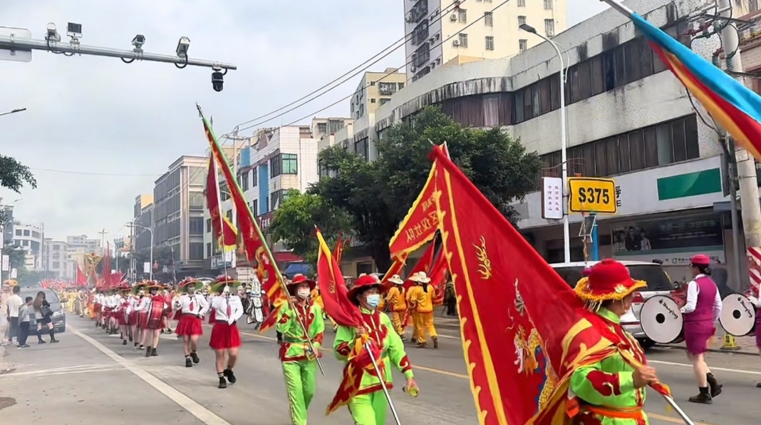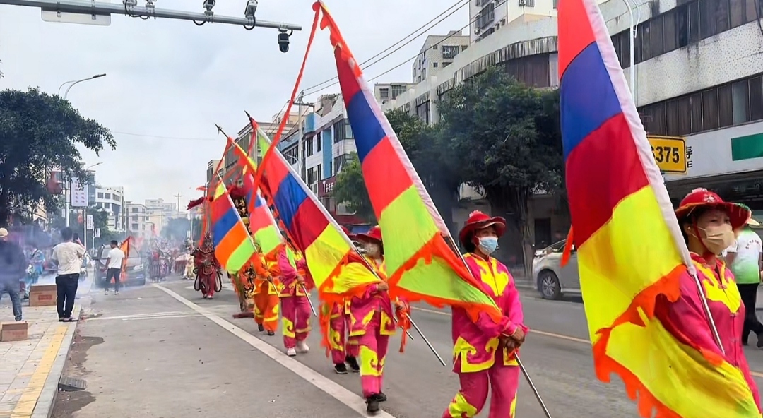八点整时,鸣锣开道,肃静回避。 四名壮汉手持铜锣,敲响庄严的序曲,宣告着古老仪式的开始,也引领着身后绵长的队伍。紧随其后的,是两面高耸入云的大令旗,“客路墟”三个大字在风中猎猎作响,彰显着这片土地的自信与热情。紧接着,“恭迎聖驾”、“列聖廓”、“天后宫”等一面面彩门旗依次排开,仿佛在向天地神明和八方宾客敞开怀抱。