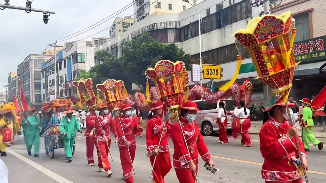 第二神轿里,客路墟天后宫的妈祖娘娘圣像端庄慈祥,两旁有宫女执日月宝扇随行,仿佛从海上来,为众生赐福;