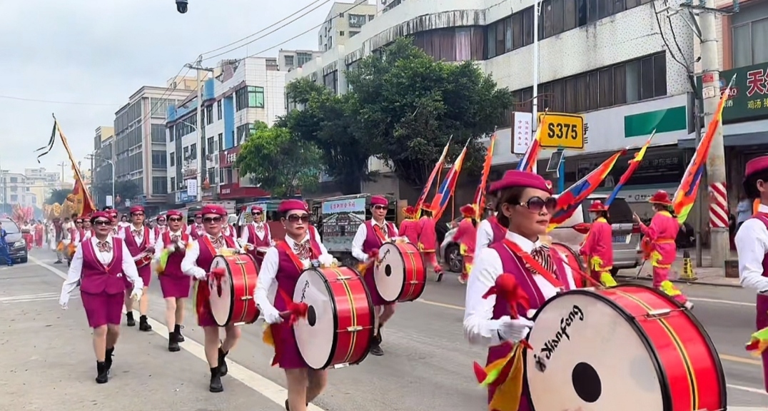 五彩斑斓的旗帜是队伍中流动的风景线。五色旗、彩龙旗、六国封相旗,一面面旗帜在阳光下熠熠生辉,象征着五谷丰登、四方祥瑞。“八仙贺喜八宝花”的表演者扮作八仙,手持宝物,为沿途的百姓送上祝福。而贯穿全程、多达五个班次的吴西湾村八音锣鼓队,更是以其高亢激昂、喜庆热烈的吹打乐,为整个巡游队伍注入了灵魂,每一个音符都在诉说着丰收的喜悦和节日的欢腾。