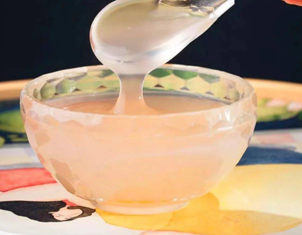 4. 试其冲:纯藕粉冲调难度稍大,需要100℃的沸水快速搅拌。成功冲调后呈半透明胶状,色泽晶莹剔透,口感顺滑粘稠。