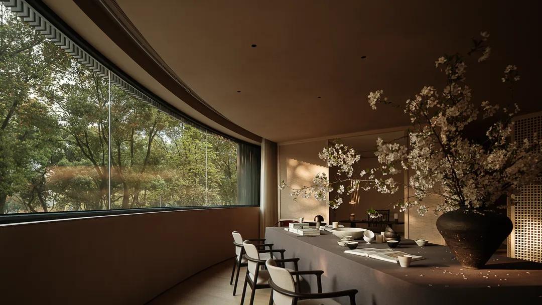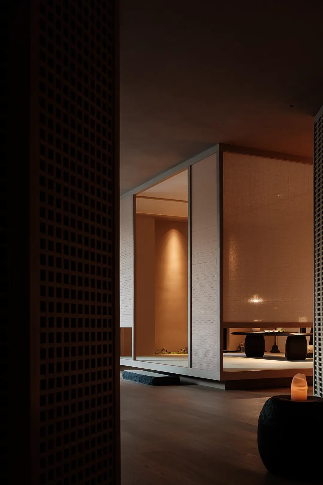 以“实”为景,黑色石材与浅木形成“重压轻抚”的稳态气质;以“虚”为构,留白墙面、柔性隔断、可穿透光影组成了更为精神化的氛围。同时,景观视角也构建了“向下看水、向上观天”的禅意体验,将“内省”与“外望”交织成冥想路径。