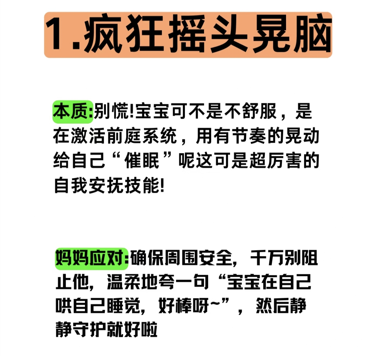 宝宝的这些“怪行为”,本质上是一种自我安抚。就像我们大人睡前会翻来覆去找舒服的姿势,或者听点白噪音帮助入眠一样,宝宝也在通过这些动作,给自己制造安全感,帮助自己从清醒状态过渡到睡眠状态。比如,摇头可以刺激前庭系统,带来类似在妈妈子宫里被摇晃的舒适感;吃手、揉脸则是模仿吃奶时的吮吸动作,能有效降低心率,让宝宝平静下来;而那些哼哼唧唧的声音,其实是他在练习“接觉”,也就是在浅睡眠和深睡眠之间,自己把自己“哄睡着”。