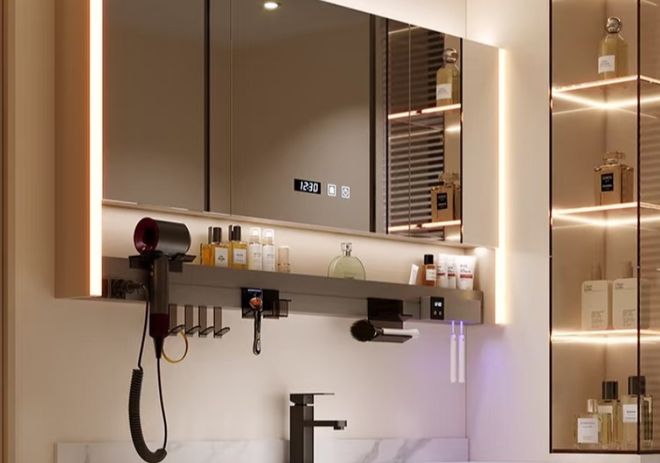 装修建议:开放格最好设置在镜柜的两端或者下方,而且内置led灯带,既能补充照明,又能提升氛围。