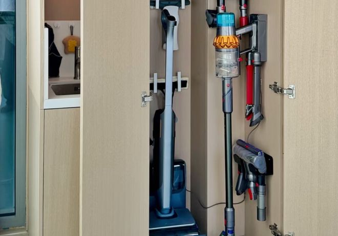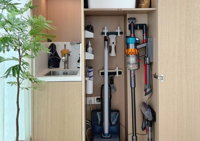 入住后你会发现,这个做法真的很明智。将扫帚、拖把、吸尘器、清洁剂、梯子等所有的家政工具,都集中收纳进柜子,关上柜门,瞬间就清爽了。