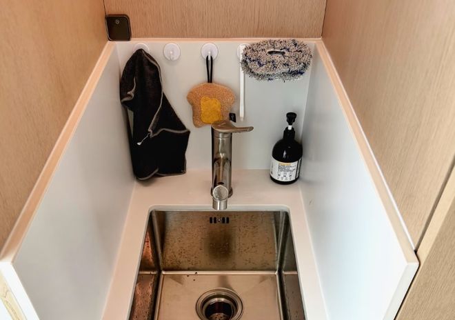 柜子的内部,提前规划好插座,上下水,并安装有洞洞板、挂钩、隔板等。