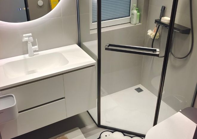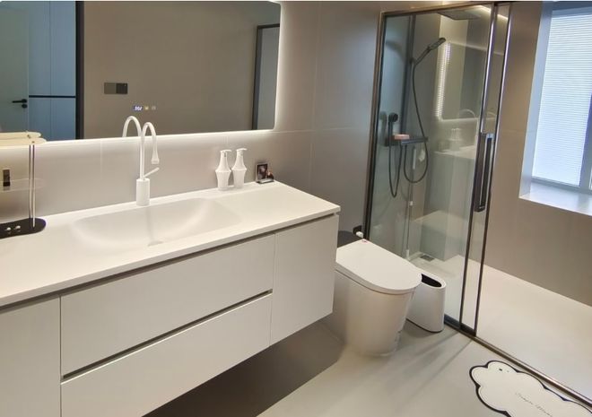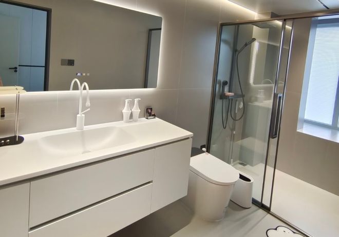 入住后你会发现,改墙排下水后,浴室柜底部的空间完全悬空,视觉上更轻盈,而且没有任何管道阻碍,可以轻松放入脸盆等大件物品,收纳能力还不错。
