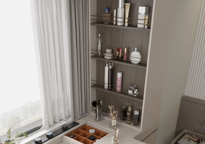 而封闭部分则隐藏所有的杂乱物品,镜子也能保留完整的镜面。