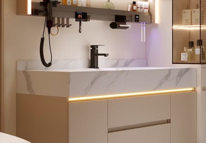 浴室柜比较潮湿,抽屉导轨务必选择不锈钢的防锈的材质。台盆建议选择一体式或者是台下盆,可以减少卫生死角。