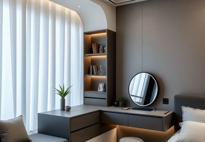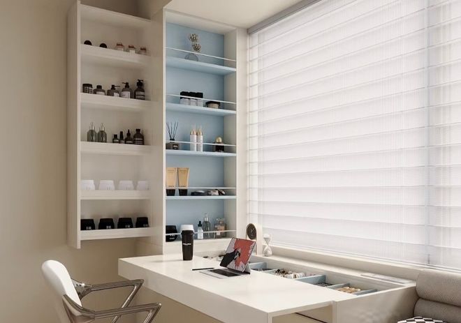 如果飘窗比较长,中间可以设计一个可以升降的小桌台,满足喝茶、办公等需求。