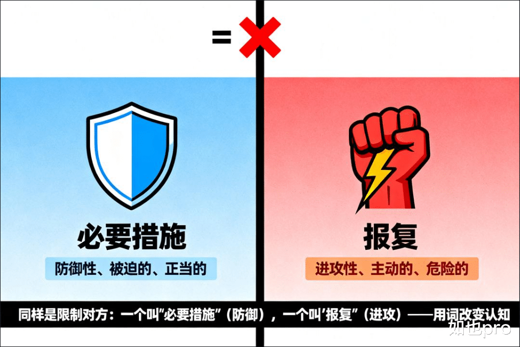 同样是限制对方,一个叫必要措施,一个叫报复。这两个词给读者的感受完全不同。必要措施听起来是被迫的、防御性的;报复听起来是主动的、进攻性的。