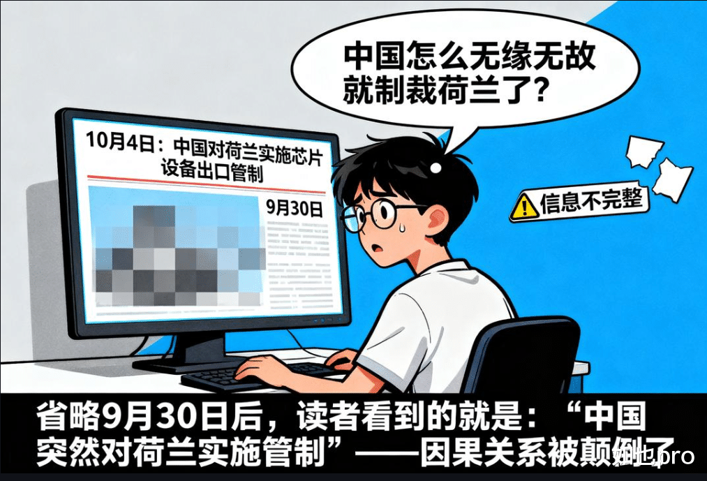 这样一来,不了解背景的读者看到的就是:中国突然对荷兰实施芯片设备出口管制。至于为什么中国要这么做,要么语焉不详,要么用中国加大经济胁迫力度这种模糊表述。