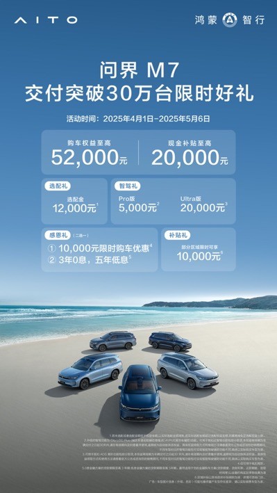 问界 新M7建议零售价24.98万元起,现在购车可享至高5.2万元限时权益,感兴趣的朋友可以去线下门店看车、体验。相信它一定会给你们带来更多惊喜。
