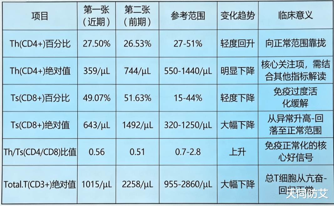 现在 CD4、CD8、总 T 细胞一起下降,是病毒被压住后,免疫系统 “退烧、冷静下来,回归正常工作状态”;