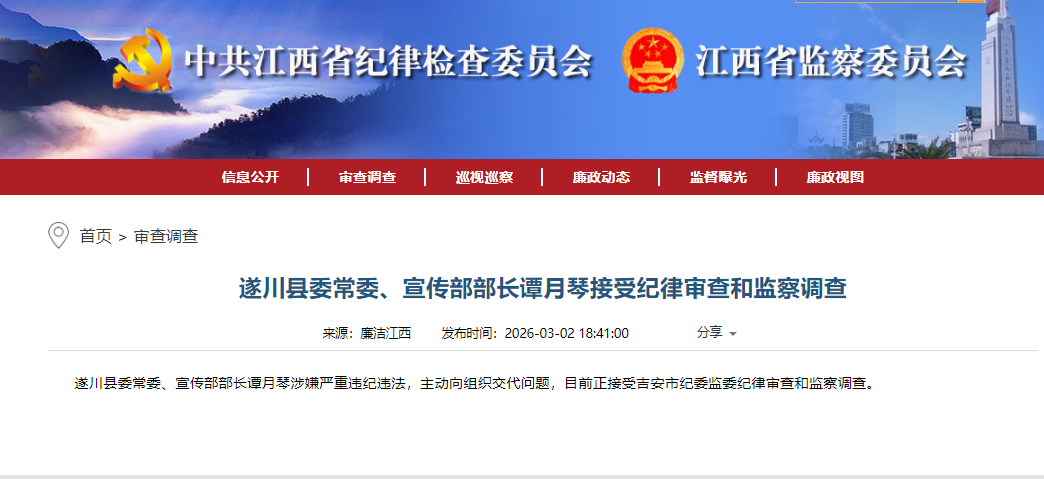 然其既久居宣传要津,掌文化项目、活动资金之权,渐忘初心。丙午年(2026)三月二日,江西省纪委监委“廉洁江西”通报:遂川县委常委、宣传部部长谭月琴涉嫌严重违纪违法,主动向组织交代问题,目前正接受吉安市纪委监委纪律审查、监察调查。昔之台上倡廉、宣讲理想之“谭部长”,今为阶下自首之嫌犯,其变若此!