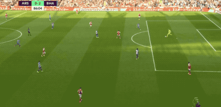 下半场开始仅仅6分钟,阿森纳的防守出现漏洞,恩西索轻松头槌破门,布莱顿取得领先。