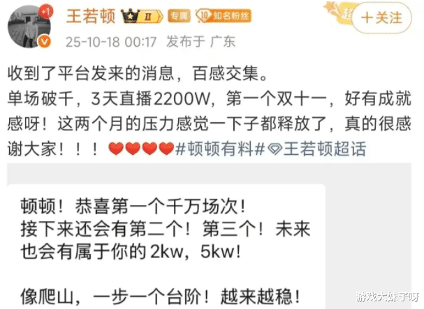 直到这个双11,顿顿终于用成绩回应了所有质疑,三天带货2200万,单场直播首次破千万,他的脸上重新露出了久违的笑容,他在直播里坦言:“这两个月的压力,感觉一下子都释放了。”那句轻描淡写的感慨背后,是数不清的夜晚与反复的自我怀疑。