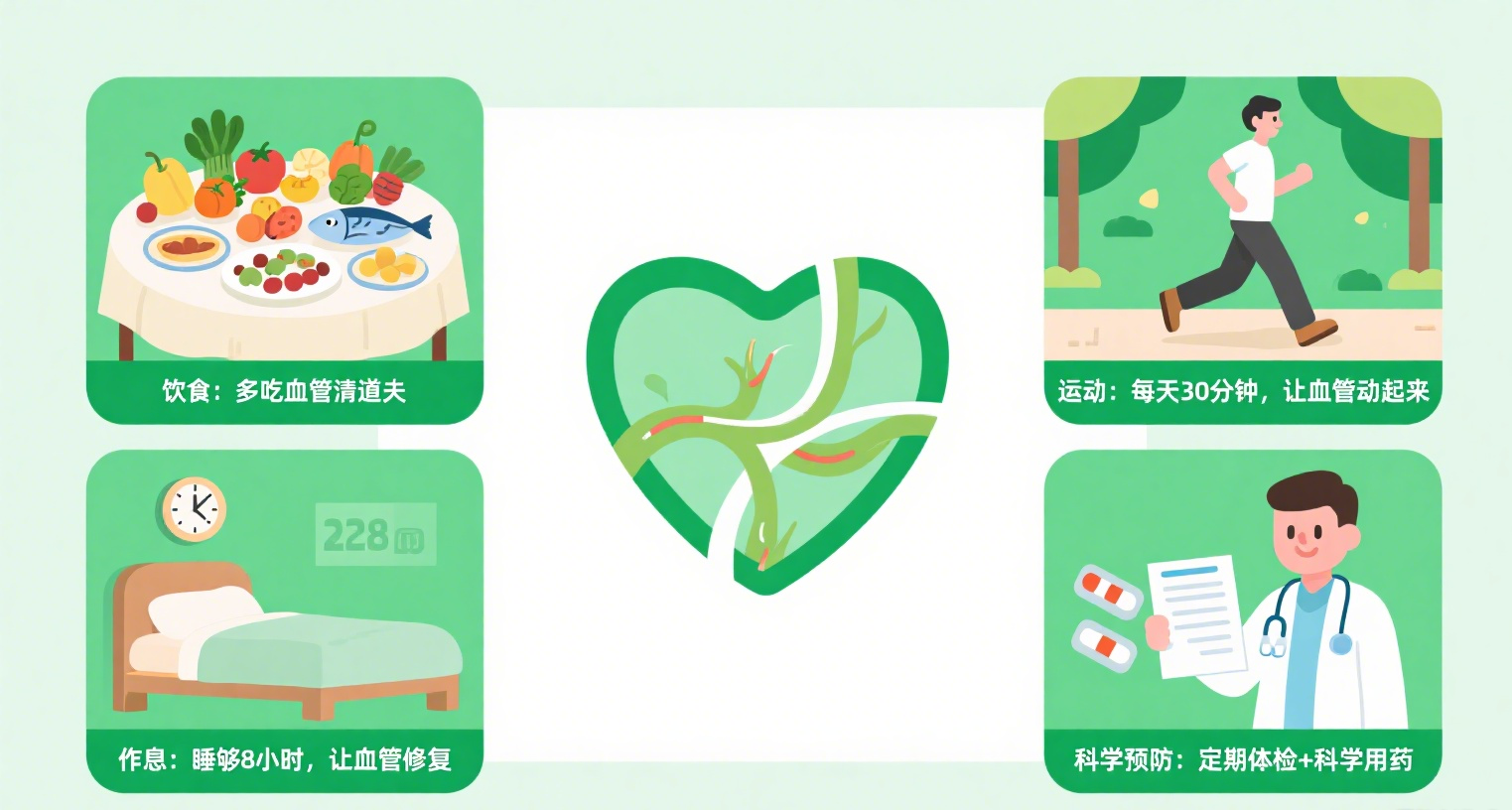 1.饮食:多吃“血管清道夫”,少吃“斑块制造者”2.运动:每天30分钟,让血管“动起来”3.作息:睡够8小时,让血管“修复”