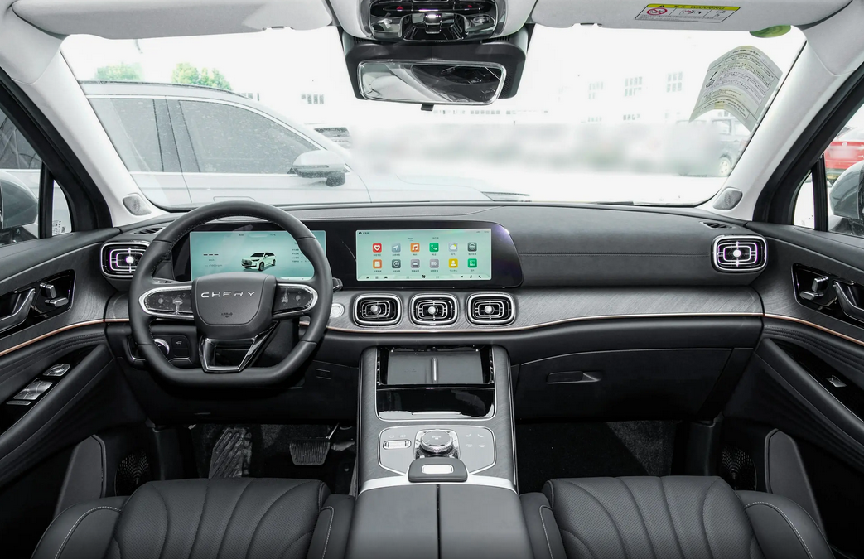 进入瑞虎9的座舱,“T”字形中控台上的矩形空调出风口还挺个性的,风向摆动也可手动调节,便利又直接。12.3英寸双联屏悬浮在中控台上,屏幕之间有较大留白,很容易影响视觉观感,虽说常规的功能均在该车上体现,但对于国内消费者来说,这样的吸引力着实不强。而且奇瑞汽车在瑞虎系列其他车型上也配备了大屏,但在瑞虎9上没有体现,真的有点儿遗憾。该款车的方向盘为平底式设计,大高个子的腿也能随意放置,视觉上又能有效提升座舱运动感。