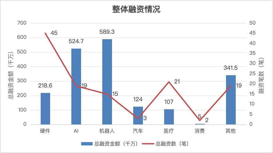 在硬件、AI、机器人、汽车、医疗、消费六大板块中,机器人和AI是近一周资本重点押注的方向。其中,机器人板块已披露交易共15笔,总融资金额达58.9亿元,为各细分领域之首。灵初智能获“国家队”资本投资,拿下20亿元Pre-A轮最大单笔投资。魔法原子、至简动力等项目也完成数亿级别融资,资本向具身智能与通用机器人方向集中。