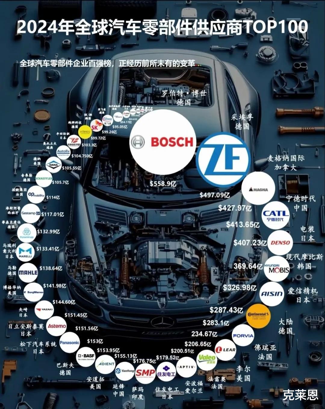 2024年全球汽车百大零件供应商,中国已经入围了15家,排在全球第4。
