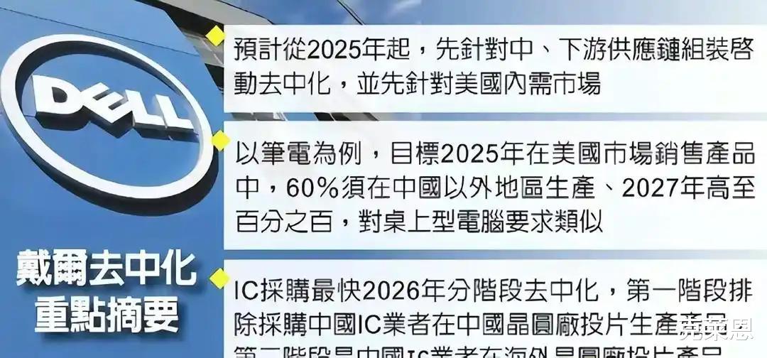 早在去年戴尔就官宣要彻底脱离中国供应链,明确表示,2025年在美国销售的产品有60%的生产来自于中国以外,2027年这一比例则要达到100%。