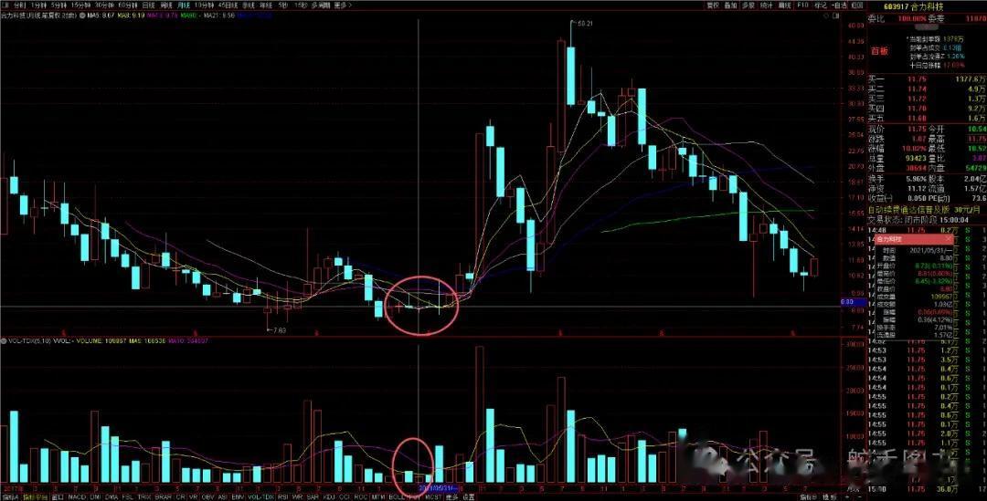 图3为合力科技(603917)月线,2021年5月,图中红圈处可以清晰地看到洗盘末端的信号,收盘价几乎一致连续5个月的小k线,其中出现了一个明显的月线大幅度缩量,成交量突然缩小到前一个月的一半以下,价格却纹丝不动,末端量价双缩,股价在一个月后就展开了反转,即使后面有一根放量的不稳定月线都没有阻止该股的上涨,第一轮就从8元涨到了27元,创出历史新高后股价回落,再次确认这根放量的k线和前期异动价的高点(关键价位),可惜这一次只有量缩,价未缩。之后展开第二轮上涨,最高价达到了50元,总涨幅超过600%。